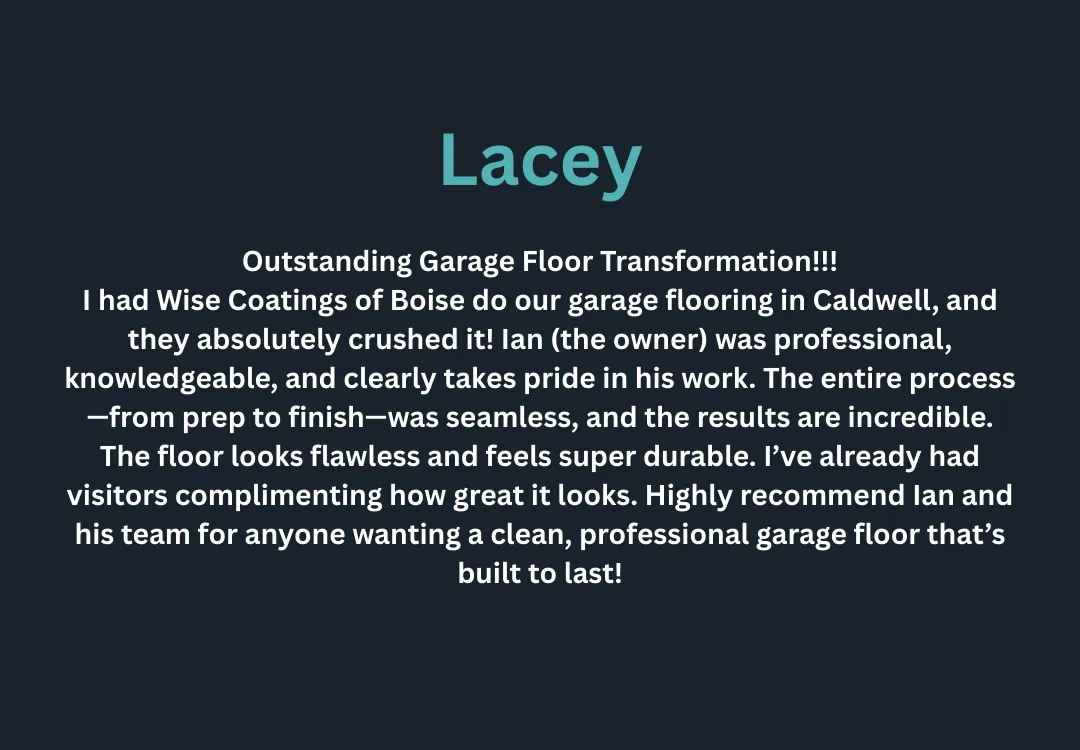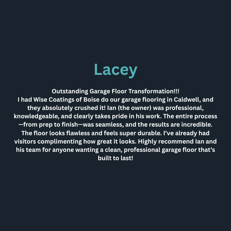 At Wise Coatings Boise, we transform Treasure Valley garages with premium polyaspartic floors that won't peel, crack, or fadeāguaranteed by our limited lifetime warranty. From your first consultation to the final installation, we deliver showroom-quality results in just one day, serving Boise, Eagle, Star, Meridian, Nampa, Kuna, Caldwell, Middleton, Emmett, and surrounding areas. Our POLYWISEĀ® coating technology and owner-led service mean you get a floor that's built to last and backed by people who actually care.
